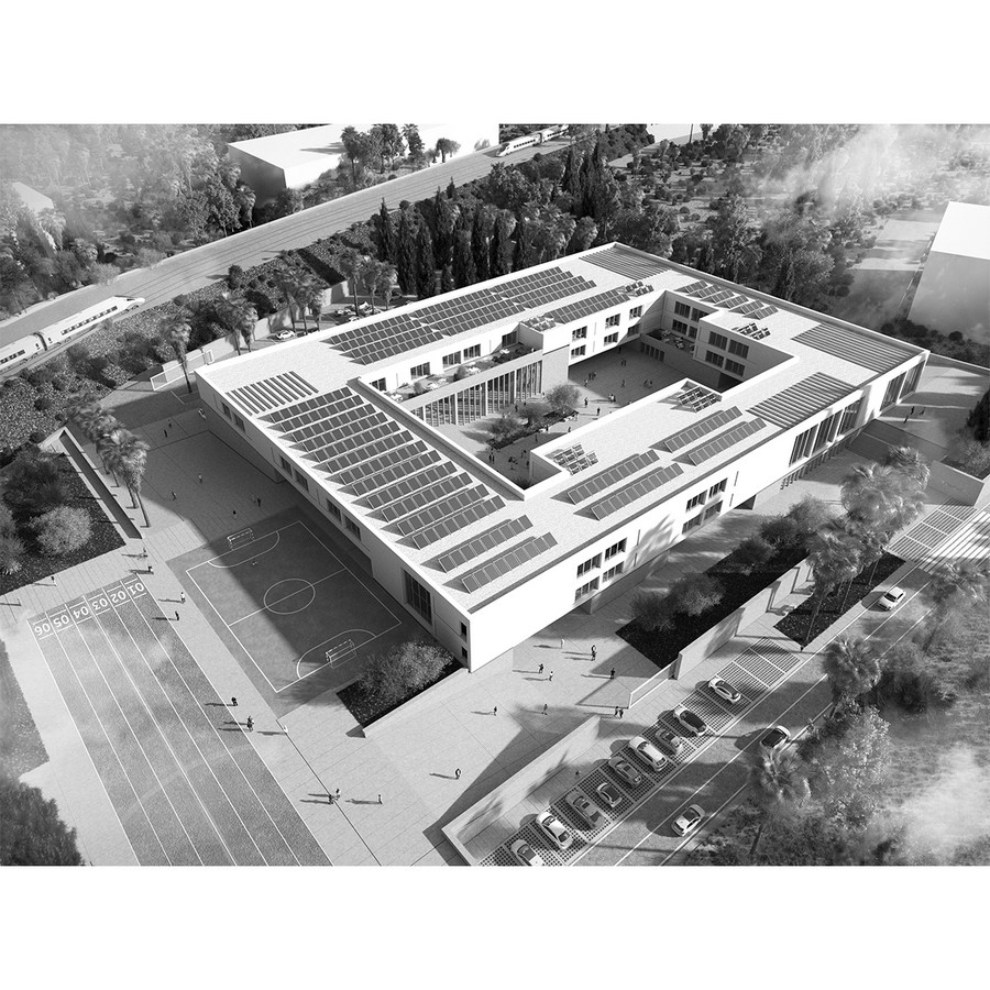 The new high school, therefore, should not only function independently but also be conceived as an integral part of the existing, so as to “complete” the inner system of the Student Citadel. For this reason, the project proposes a “social landscape”, carved out of the distance between the existing volumes and dedicated to the meeting of the students.